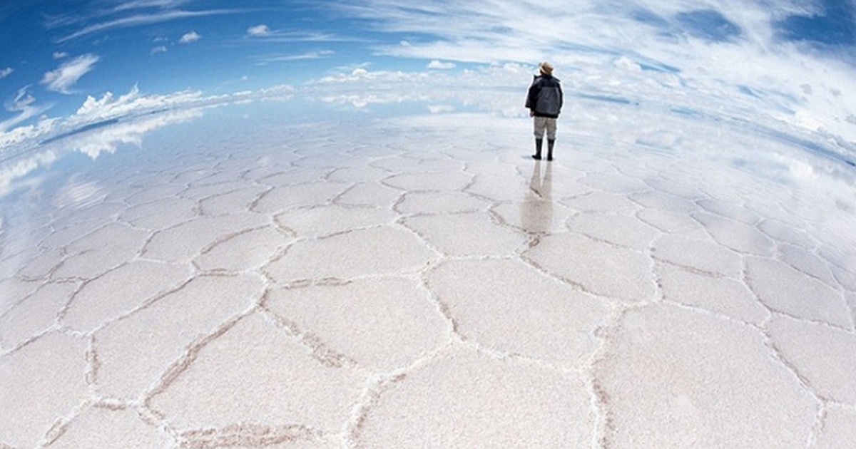 Высохшее соляное озеро Салар де Уюни. Иллюзия хождения по воде.