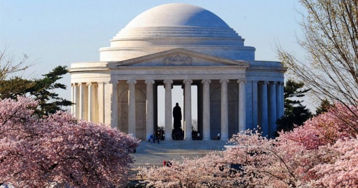 Весной цветущие деревья вишни обрамляют фасад мемориала Томаса Джефферсона у залива Тайдал Бэйсин.
