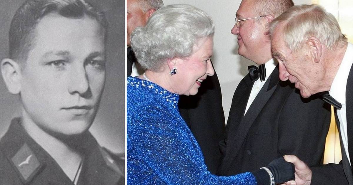 Британская королева Елизавета II пожимает руку легендарному вратарю Берту Траутманну в зале Берлинской филармонии, 3 ноября 2004 года. Фото: twitter.com