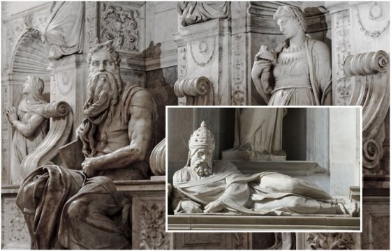 Слева направо: Моисей работы Микеланджело Буонарроти, гробница (1505-1545 годы) Юлия II. \ Макет неосуществлённой гробницы папы Юлия II. Церковь Сан-Пьетро-ин-Винколи, Рим.