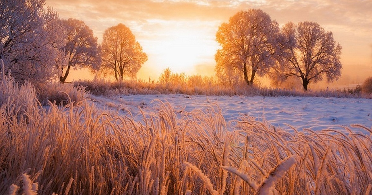 Поля и травы укрыты снежным покрывалом на закате дня.