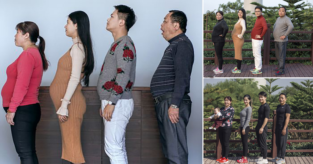 Когда жена китайского фотографа была на восьмом месяце беременности, парень пригласил своих родителей пожить некоторое время у них дома, чтобы помочь жене справляться и с хозяйством, и с заботой о новорожденном. Тогда же фотограф решил сделать семейный портрет на память. Сделав фотографию, семья развеселилась: казалось, что беременны они все — насколько их физическая форма была далека от идеала. И тогда парень начал полугодовой проект, в течение которого все члены семьи кардинально преобразились.