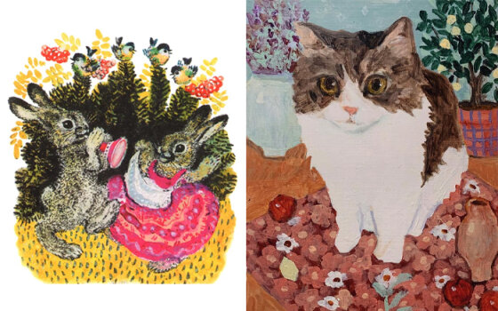 И немного современной иллюстрации, призванной дарить радость. Художница из Южной Кореи, работающая под ником itsSelynn, в несколько наивном стиле рисует яркие, добрые картинки, полные… котиков в платочках (именно их называют «бабушкотиками», и не так давно эти милые образы, как принято говорить, «взорвали Интернет»), уютных коротколапых собачек и хомяков в панамах. Ее персонажи резвятся на полянках, строго смотрят на зрителя, играют вместе или размышляют в одиночестве - в общем, живут без забот и хлопот.