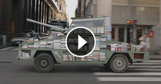 Мир полон сильных людей и добрых чудаков, чьими стараниями происходят всевозможные удивительные и необъяснимые, с точки зрения здравого смысла, события. Вот и этот парень соорудил настоящий танк, под завязку набитый книгами, которые он с удовольствием совершенно безвозмездно раздает прохожим.