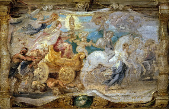 В августе 1601 года Рубенс прибыл в Рим. Там новый стиль барокко, провозглашённый Аннибале Карраччи и Караваджо, Микеланджело и Рафаэлем был быстро усвоен Рубенсом. Его первая крупная римская работа была связана с тремя большими картинами для часовни-склепа Святой Елены в базилике Санта-Кроче.