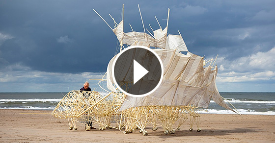 Его скульптуры, - неопределенные создания: гигантские многоножки или скелеты неведомых животных. Они приходят в движение лишь от дуновения ветра и довольно реалистично "бегают" по нидерландским пляжам, вселяя в случайных прохожих ужас. И, действительно, встретив такое возле моря, залюбуешься только в том случае, если находишь на почтенном расстоянии. Иначе - сначала небольшая паника, шок и столбняк.