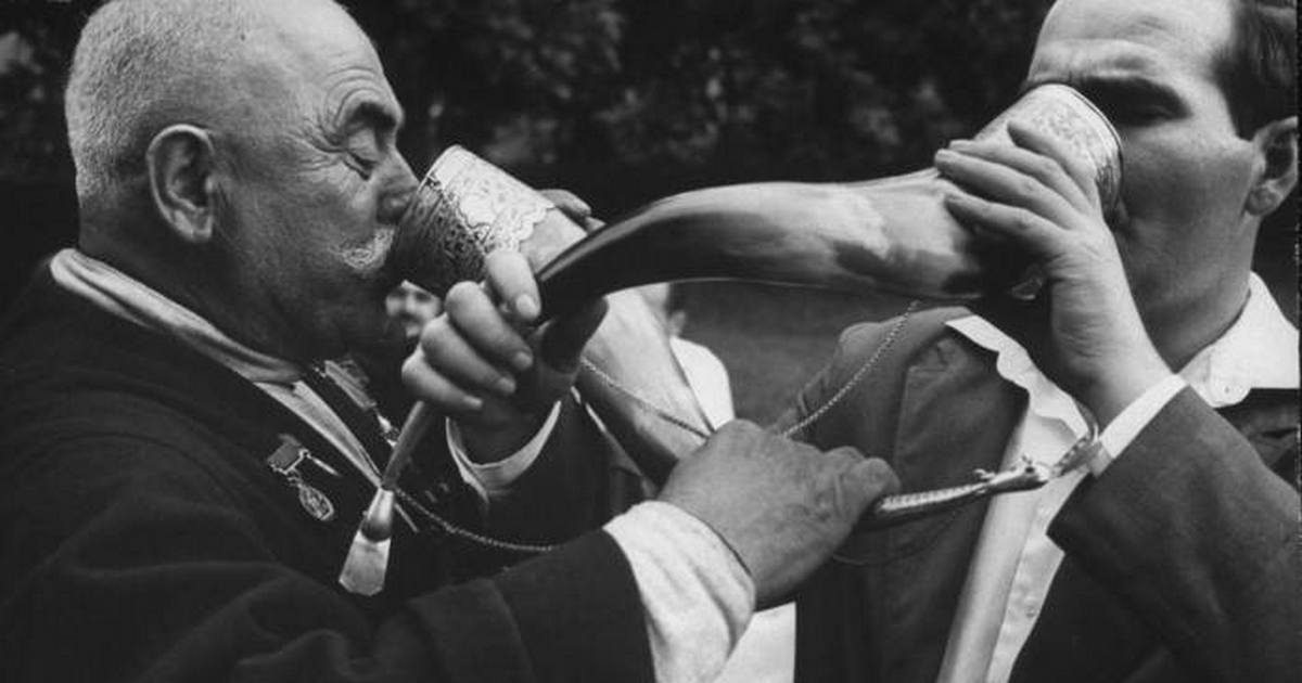 Ритуальное распитие вина из рогов на вечеринке во время посещения винодельческой фермы. СССР, Грузия, 1963 год.