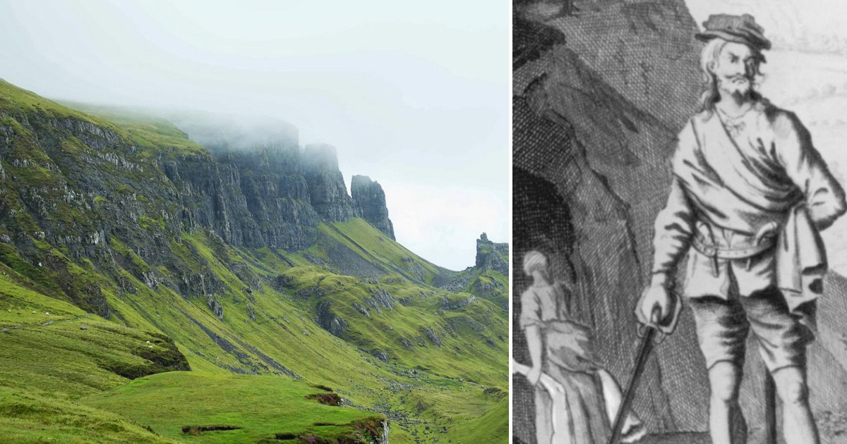 Александр «Соуни» Бин возле своей пещеры. Рисунок XVIII века. | Фото: clan.com.