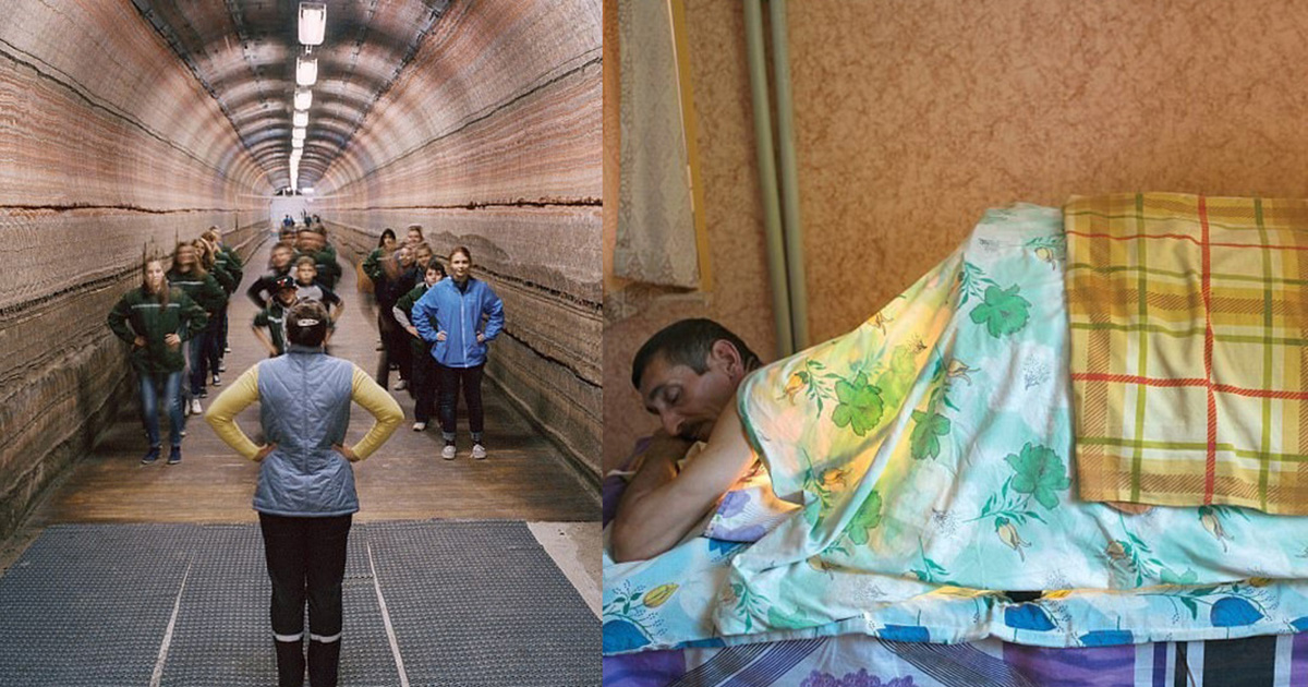 Отдыхающие тренируются и дышат в подземной соляной шахте.