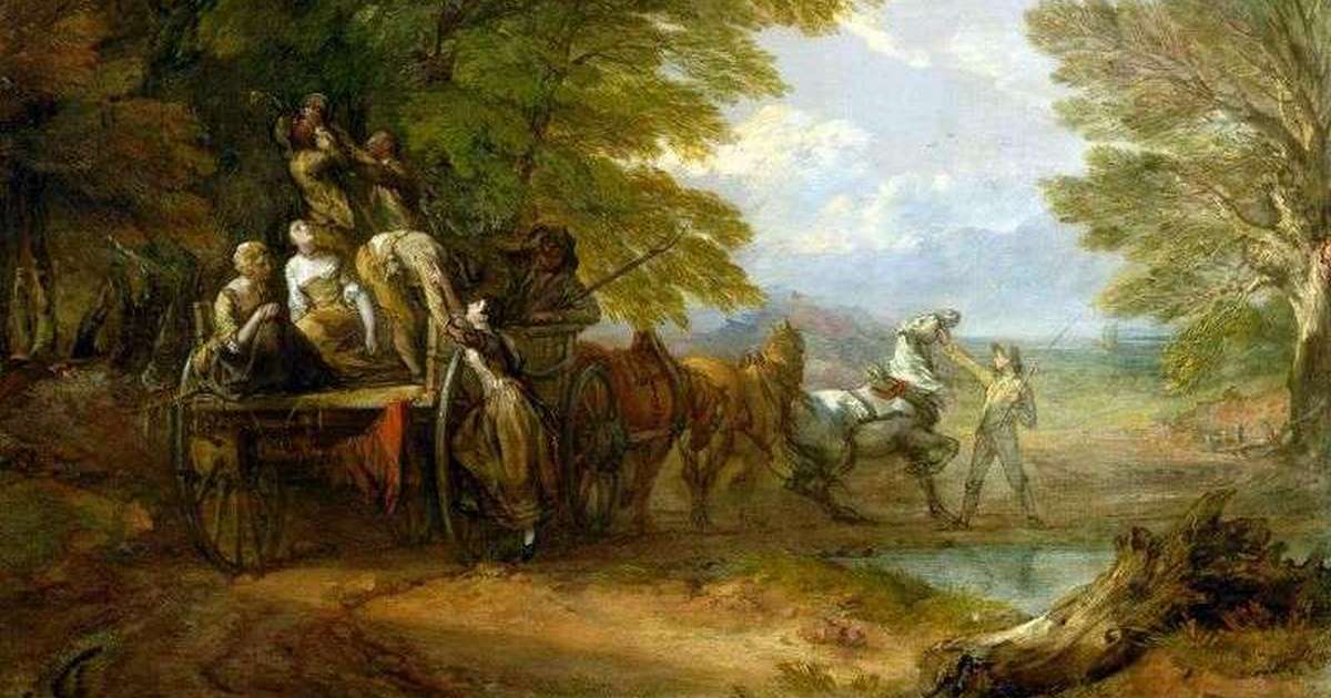 Картина Томаса Гейнсборо «Поездка на рынок» 1773 года была названа одной из лучших работ художника. На ней изображена группа людей верхом на лошадях, путешествующая по сельской местности и проезжающая рядом с нищей матерью с ребенком. Героев сопровождает прекрасный мастерский пейзаж в духе Гейнсборо: мягкая кисть, блеклая однотонная палитра (коричневый-серый-зеленый) и его визитная карточка - деревья. Многие утверждают, что картины Гейнсборо можно распознать по деревьям (соглашусь с ними). Это всегда кучковатые перистые ветки деревьев, обычно склоненные в сторону, а листья их написаны в темно-зеленой гамме.