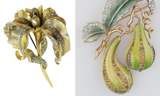 Облегченные конструкции и новейшие материалы позволяли делать крупные украшения с нетривиальными образами. На платьях и пальто американских модниц появляются балерины и экзотические птицы, огромные цветы, и даже… овощи. Редис, кукуруза, острый перец – оригинальные и ироничные мотивы, которые Буше без тени сомнения предложил публике.