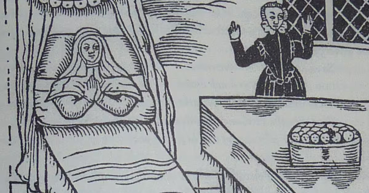 Анонимная гравюра 1620 года, изображающая Маргариту после родов и детей в сосуде.