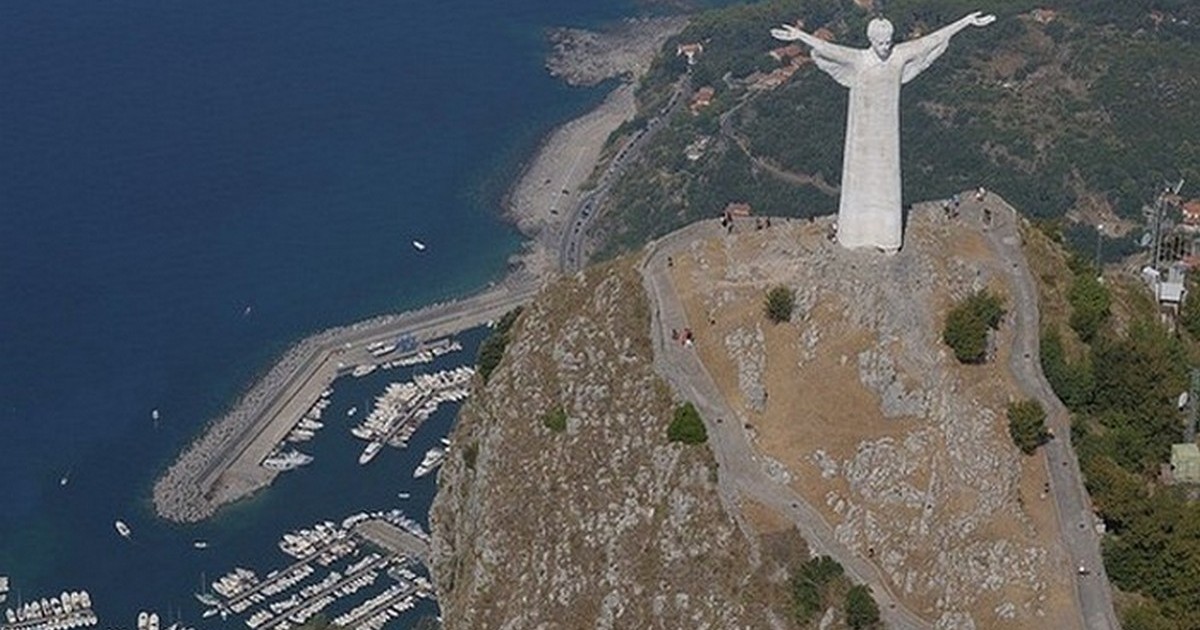 Фигура Христа на вершине скалы возле города стоит, раскинув руки в сторону города, как бы обнимая его.