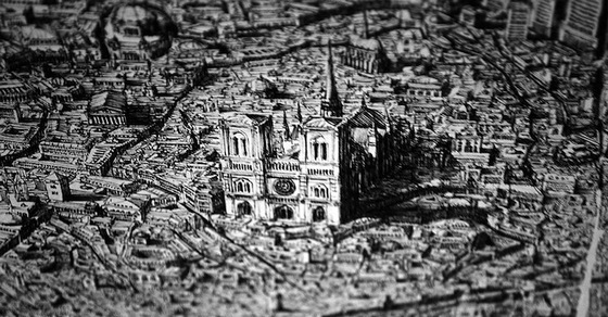 С поразительной целеустремлённостью и бесконечным запасом терпения художник Бен Сэк (Ben Sack) твёрдой рукой берёт чёрный лайнер со стержнем 0.05 мм и начинает отрисовывать плотно скомпонованные, невероятно детализированные пейзажи вымышленных городов с полным набором зданий, дорог, рек и мостов.