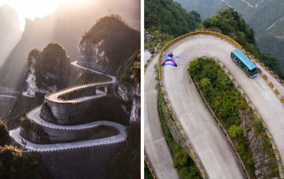 "Небесное шоссе" на Тяньмэньской горе в Китае известно своими экстремальными условиями, но среди них больше всего пугают резкие повороты. Всем водителям нужно быть очень внимательными, ведь всего одна ошибка может привести к падению с обрыва.