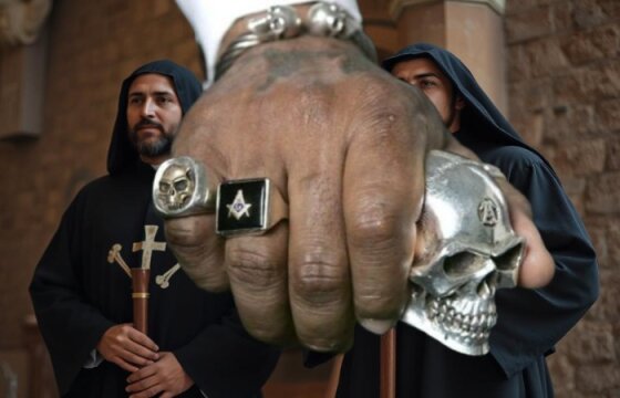 Символ череп с костями облюбовали и масоны. Вольным каменщикам она напоминала о неизбежности смерти. Ссылку к этому событию можно найти в романе Льва Толстого «Война и мир», когда Пьер Безухов здоровается с новым знакомым и замечает у него на пальце кольцо с черепом, сразу понимая, что тот принадлежит к масонам. Вероятно, классик имел в виду древнюю организацию «Череп» - самую старинную группировку в Европе. Тайное общество появилось в 1772 году в Кенигсберге, нынешнем Калининграде. И эта организация благополучно просуществовала долгое время, пока к власти не пришли нацисты, запретив масонские организации. Но по окончании войны, в 1947 году, ложа была восстановлена, однако местом для возрождения стала Западная Германия, потому что Кенигсберг отошел СССР.