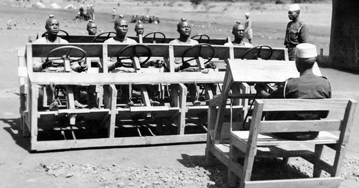 Обучение вождению королевских африканских стрелков в 1943 году. Камень на голове приучает учеников не опускать голову и смотреть всё время на дорогу.
