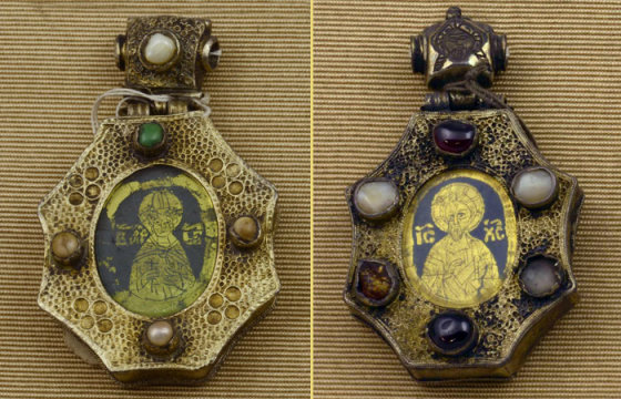 К новгородскому кругу на основе указанных признаков мы причисляем наперсные иконки с изображениями под хрусталями и стеклами мучениц Екатерины, Варвары, Параскевы и других особо почитаемых в Новгороде святых. Некоторые рисунки на золоте наносились с оборота на плоские стекла или хрустали, изготавливать которые было намного тяжелее, чем кабошоны. Если обратить внимание на все панагии, прикрытые плоскими стеклами, то можно заметить, что изображения за ними по краю обведены золотой рамкой, по месту расположения соответствует скошенной фаске по борту стекла.