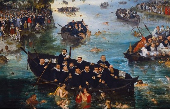 Кульминационный центр полотна - а это две лодки с ловцами душ, отражает событие, вокруг которого и собралась эта огромная рать. В одной - толстый епископ со своими приближенными, в другой - группа протестантов. И те и другие пытаются выловить из реки души спасенных христиан. Однако обе лодки и так переполнены - представители духовенства заняли все места и спасенным особо надеяться не на что. И зрителю совсем не понятно каким образом ловцы надеятся в своих лодках разместить свой улов.
