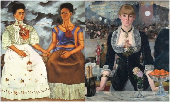 Фрида Кало была мексиканской художницей, которая известна своими автопортретами, часто включающими символические изображения физических и психологических ран. У неё были бурные отношения с другим известным мексиканским художником Диего Ривера, во время которых они поженились, развелись и снова поженились. «Две Фриды» были созданы примерно во время развода Кало с Диего Ривера, и считается, что картина изображает её потерю. Это двойной автопортрет. Фрида слева одета в белое платье европейского стиля с её сердцем, разорванным и кровоточащим, в то время как Фрида справа одета в традиционное мексиканское платье с её сердцем, всё ещё целым. Через год Кало снова вышла замуж за Риверу, и, хотя их второй брак был таким же беспокойным, как и первый, он продлился до самой её смерти. Эта картина является самой большой работой Кало, а также её самой известной.