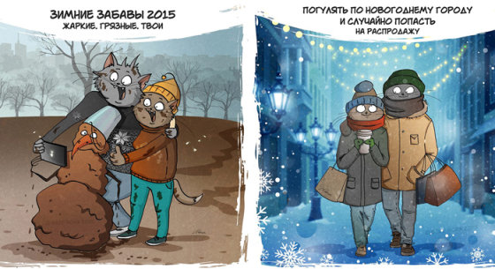 Новогодние праздники уже прошли, хотя впереди еще Рождество, и для многих каникулы еще продолжаются. Московский художник Bird Born создал серию иллюстраций к ощущению зимы и праздника, поставив главными героями милых котиков. Это очень узнаваемые ситуации, и оттого вызывающие тепло на душе, заставляющие улыбаться и еще сильнее ценить прекрасные моменты жизни.