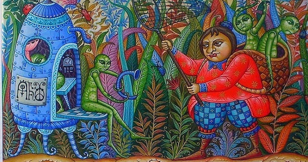 Здесь драконы и инопланетяне, пресловутый Гулливер и звездочет, путешественники на воздушных шарах и эльфы, космические корабли и летающие тарелки, а также многое другое, что удивляет зрителя и заставляет подолгу рассматривать весь этот ералаш. Создается впечатление, что фантазии художника нет предела. Он так мастерски трансформировал во времени своих персонажей, перемешал в единое целое несколько историй и создал свою удивительную сказку.