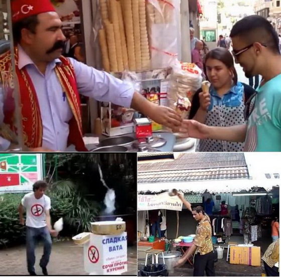 Некоторые торговцы превращают рутинную работу в увлекательное шоу. Покупатели увлеченно следят за отработанными движениями и ловкими трюками, ведь повторить такое без предварительных тренировок невозможно. В нашем обзоре пять видеозаписей виртуозных «выступлений» уличных продавцов.Танцующий продавец сахарной ваты в Сочи