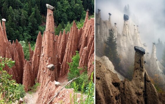 На плато Риттена, что в северной части Италии, есть потрясающее чудо природы: узкие высоченные шпили из мягкой глины, увенчанные твердыми каменными глыбами. Создается впечатление, что это какой-то шутник-великан наградил каждую тонкую башенку своей «шляпкой». Правда, некоторые шляпки попадали со своих шпилей.
