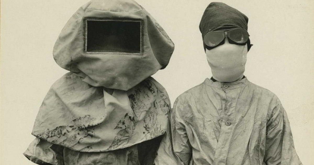 На этом снимке 1912 года запечатлена пара людей, одетых в специальные защитные костюмы, которые помогали им избежать заражения чумой во время исследований эпидемии на Филиппинах.