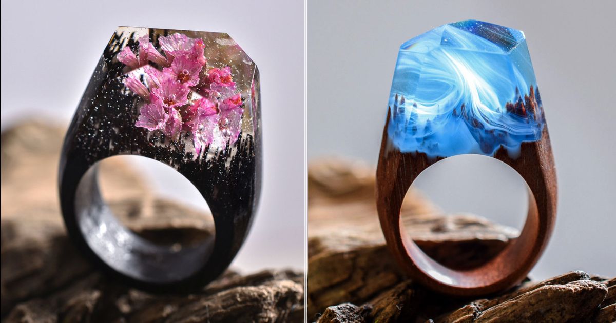 Розовые цветы, голубые волны, аметистовый лес – всё это и многое другое притаилось в великолепных деревянных кольцах ручной работы, которые продаются в канадском магазине «Secret Wood». И совсем неудивительно, что яркие, но при этом ненавязчивые аксессуары с магическими пейзажами внутри изделия, так привлекают внимание модниц со всего мира, ведь каждое украшение – маленькое произведение искусства, заставляющее поверить в чудеса.
