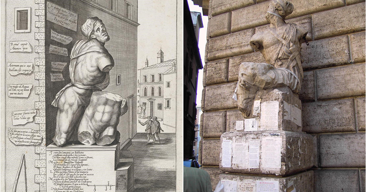 В течение нескольких столетий жители Рима выражали своё недовольство политикой властей весьма эксцентричным способом. Они сочиняли сатирические пасквили, высмеивающие монархов, дворян и даже Папу, а потом размещали их на статуях, которые украшали улицы города. Очень часто такие анонимные послания выходили за рамки обсуждаемой темы, люди начинали использовать переписку на статуях в качестве общения и как банальную доску объявлений. Скульптуры получили известность во всём мире, как «говорящие статуи Рима» или Конгрегация остроумия.