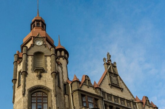 Кстати, при восстановлении великолепных часов на угловой башне выяснилось, что большая часть как наружных, так и внутренних элементов (в том числе, часового механизма) практически разрушена. Поэтому часы пришлось снять, и их отреставрировали отдельно, изготовив некоторые детали с нуля. Старый механизм заменили на электронный. Чтобы определить, каким был первоначальный облик часов (за десятилетия их вид изменился до неузнаваемости), специалисты изучали архивные документы и фото.