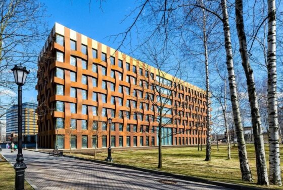 Скульптурный фасад семиэтажного здания выполнен из стекла и стали кортен (corten steel). Если со стеклом всё понятно – его часто можно встретить на современных фасадах в больших российских городах, то кортен для отечественной архитектуры еще не очень привычный материал, хотя здания, облицованные им, встречаются по всему миру.