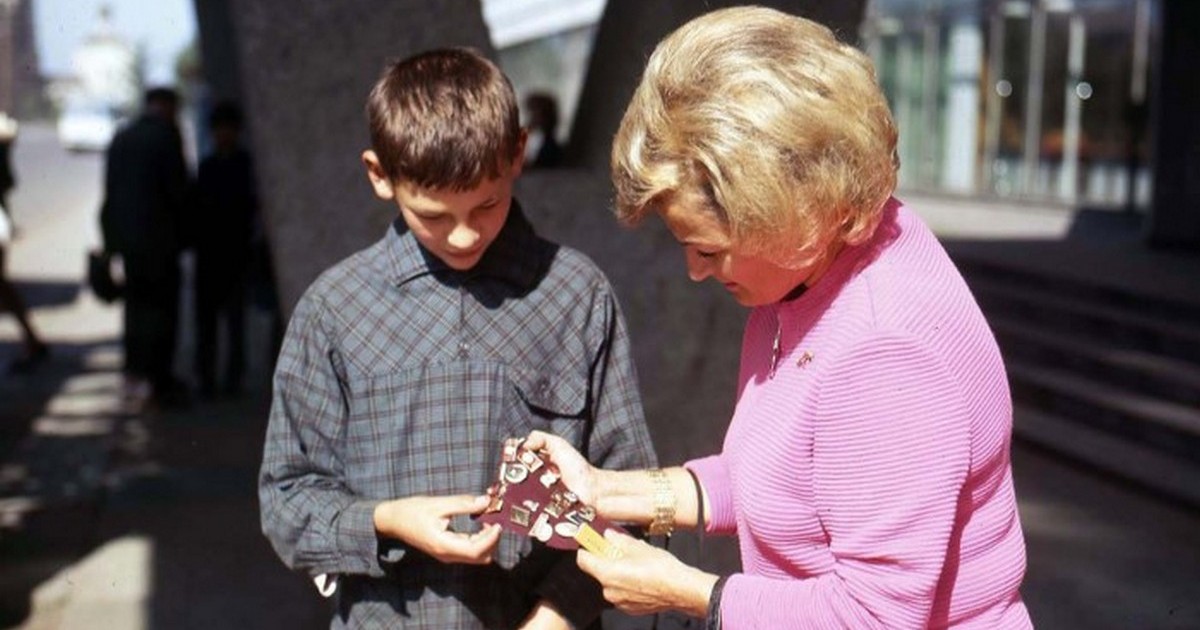 У входа в гостиницу Ангара Мальчик предлагает женщине значки с изображением Ленина. СССР, 1969 год.