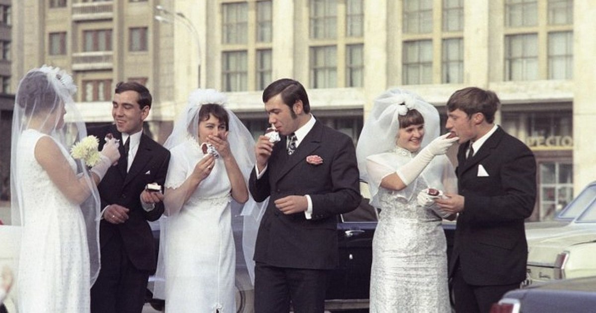Молодожёны неподалёку от ЗАГСа. СССР, Москва, 1972 год.