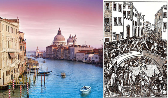 По мостам Венеции сегодня ходят тысячи туристов каждый день, однако были времена, когда было лучше держаться от них подальше — в течение примерно стал лет в течение осени и зимы на этих узких скольких мостах устраивались рьяные драки — да не просто один на один, а целой толпой против другой такой же толпы.