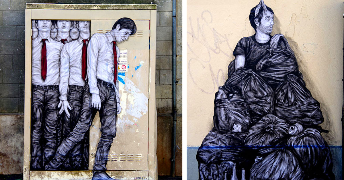 Чарльз Леваль (Charles Leval), известный как Levalet, - это своего рода французский аналог Бэнкси. Его работы нередко посвящены острым социальным темам или так или иначе обыгрывают проблемы современного мира. Чаще всего Levalet создает свои работы в черно-белых тонах, хотя в последний год было несколько работ, выполненных в цвете. Излюбленных прием художника - включать в свою работу архитектурные детали города, будь то электрощит, столб, дверь или фонтан в виде головы льва. Такие работы сразу привлекают внимание прохожих - они изящны, ироничны и выделяются на фоне пустых стен.