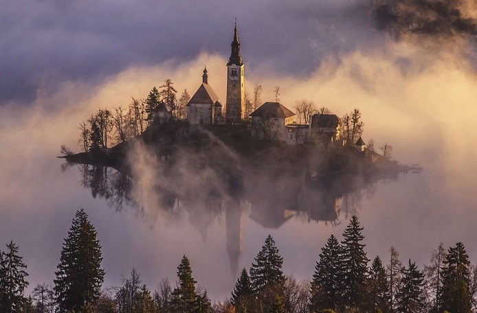 Посреди словенского озера находится одинокая церковь. Клубы тумана обволакивают ее со всех сторон, создавая ощущение нереальности происходящего, а звуки колоколов разносятся далеко по водной глади, наполняя прихожан умиротворением и спокойствием.
