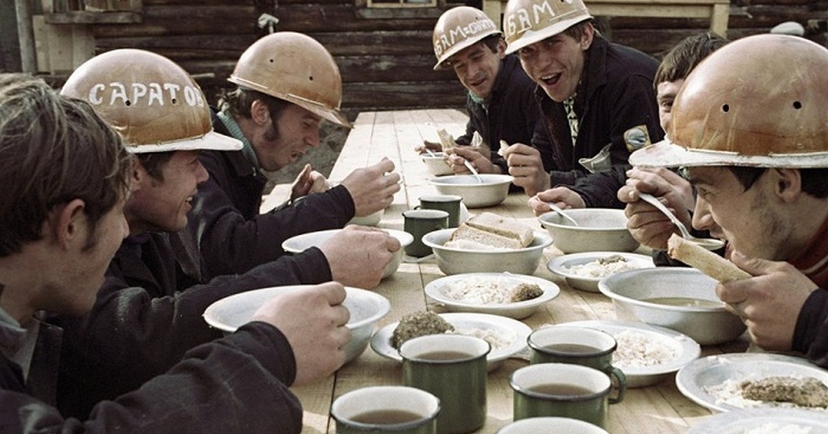 Обеденный перерыв рабочих во время строительства Байкало-Амурской магистрали.