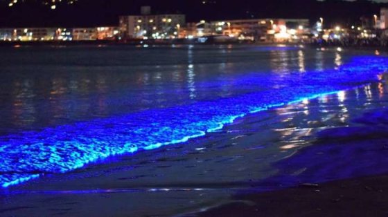 Особенно эффектно смотрятся волны, когда они разбиваются и пенятся. Даже в песке вымытые волнами на берег водоросли способны освещать дорожки посетителям пляжей.
