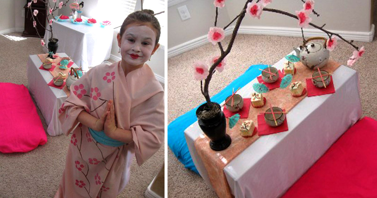 Причиной дискуссии стала вечеринка по случаю дня рождения маленькой Кейтлин. Мама решила устроить не просто посиделки с тортом, а сделать тематический обед — и выбрала для темы японское чаепитие. Из обычной коробки, накрытой скатертью, она соорудила стол, положила на пол подушки, прилепила бумажные цветы на высохшую ветку, имитируя цветущую сакуру, раскрасила дешевую простынь розовыми цветами, соорудив кимоно для именинницы.