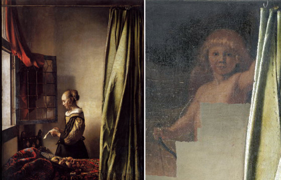 Есть еще одна любопытная деталь, которая доказывают романтический подтекст картины. Скрывается она … за зеленым занавесом. Действительно, какова его цель на картине? Красный ковер прекрасно резонирует с красной шторой. Какую роль играет зеленый занавес? Дело в том, что рентгеновские снимки на холсте показали, что изначально Вермеер написал образ Купидона на картине. Когда-то этот путто смотрел на зрителей в правом верхнем углу, за занавесом, а позже кто-то по непонятной причине закрасил ангела и написал его месте занавес. Одно известно точно – это не корректировка Вермеера.