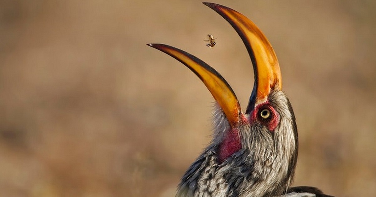 Жёлтоклювая хищница птица-носорог выхватывает термитов в воздухе. Автор фотографии: Виллем Крюгер (Willem Kruger), Южная Африка.