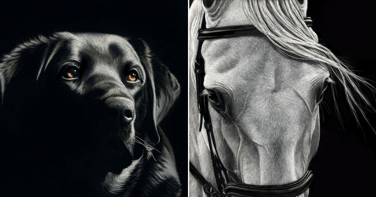 На создание своих шедевров Cathy Sheeter тратит порой несколько месяцев. Но это стоит того – достаточно посмотреть, насколько реалистичными получаются её картины, выполненные в необычной технике. Никакой кисти и палитры! Художница свои картины не пишет, а процарапывает самыми различными острыми предметами на поверхности, покрытой чёрными чернилами. Теперь вы знаете всё. Просто смотрите.