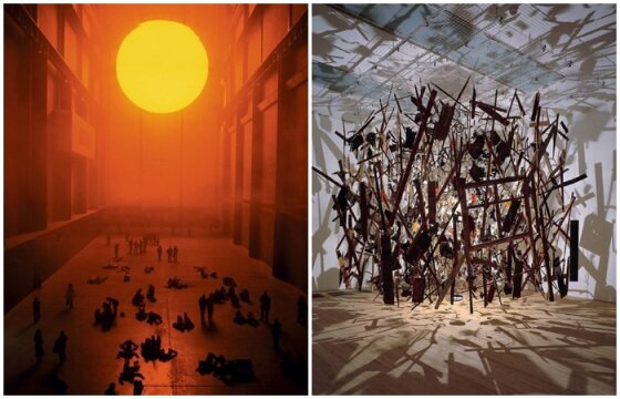 Датско-исландский художник Олафур Элиассон разработал свою впечатляюще амбициозную инсталляцию «The Weather Project», которая олицетворяет эффект огромного солнца, появляющегося сквозь тонкую и зыбкую пелену тумана. Низкочастотные лампы вокруг его искусственного солнца позволяли солнечному золотому сиянию доминировать в пространстве, уменьшая все окружающие цвета до волшебных оттенков золота и чёрного. Мастер иллюзии сделал свой светящийся шар из полукруга света, отражающегося зеркальными панелями на потолке, которые завершают круг, придавая верхней половине солнца туманное, мерцающее сияние, имитирующее настоящее солнечное свечение. Эти зеркальные панели были размещены по всему потолку, позволяя посетителям видеть своё отражение, как будто парящее в небе над ними, создавая ощущение невесомости в пространстве.