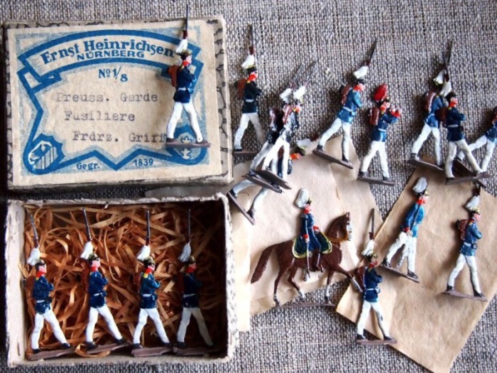 Оловянных солдатиков стали производить в Германии в конце XVIII–начале XIX веков из-за того, что олово перестало быть востребованным для производства посуды. Появилась керамическая посуда, и некоторые производители перестроились на изготовление игрушек – отливали солдатиков и прочие игрушки из податливого материала. Оловянные миниатюры солдат стали производить в Нюрнберге, Аугсбурге, Берлине, Потсдаме и других городах. Позже это подхватили другие страны, а в России они стали настолько популярны, что их можно было купить в любом городе и в любом магазине. Но это было уже в начале XX века, и они утратили тот оригинальный вид, который создавался для детей императоров.