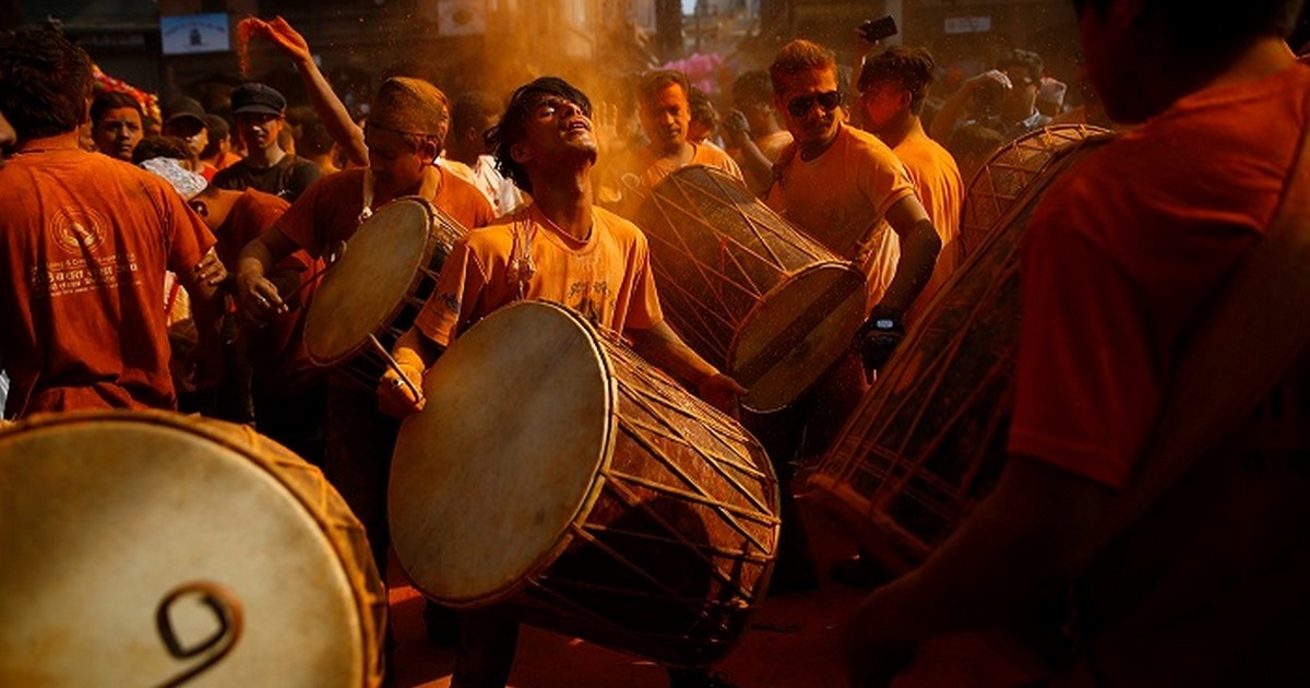 Празднование Нового года продолжается на улицах Непала под звуки барабанов и посыпанием окружающих оранжевым порошком.