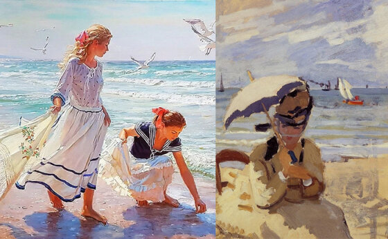 А вот пляжные сценки с прекрасными незнакомками в шляпках и оборках, с кружевными зонтиками, очень популярные в последнее время в социальных сетях и у любителей той живописи, что призвана радовать глаз – написаны нашим современником. Александр Аверин родился в 1952 году в Московской области. Сегодня он признанный мастер «винтажных» жанровых сценок.