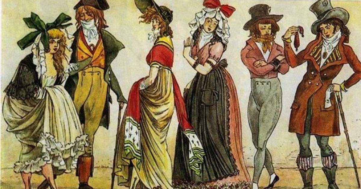 И у революционеров, и у их противников в моду резко вошла античность. Отличительным знаком сторонников революции был, например, красный фригийский колпак, а девушки-монархистки носили полупрозрачные платья фасона, напоминавшего, с их точки зрения, древнеримские женские одеяния, и сандали или плоские туфли на ремнях, похожих на сандальные.