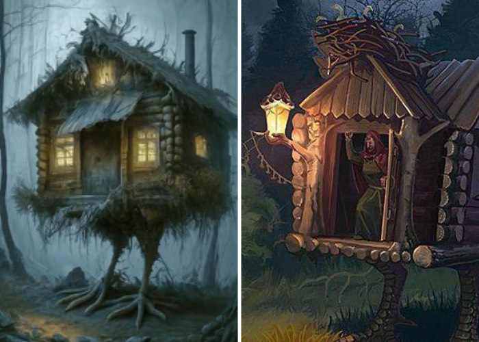 Известный элемент народных сказок о Бабе Яге - ее необычная избушка, высоко поднятое на курьих ножках. Уникальность данного жилища заключается в его способности изменять ориентацию по специальному приказу, когда оно обращается лицом к посетителю и спиной к лесу.
